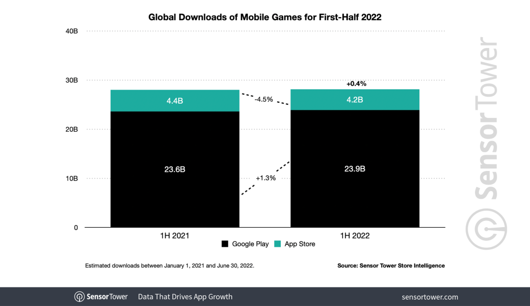 下载量方面,Sensor Tower 称在 2022 年上半年,苹果 App Store 和 Google Play 商店的手游全球总下载量约为 281 亿次,同比上升了 0.4%。其中,仅 Google Play 的手游下载量就达到了 239 亿次,同比增幅为 1.3%。作为比较,App Store 上半年手游下载量大约为 42 亿次,与去年同期数据(44 亿次)相比下滑了 4.5%。