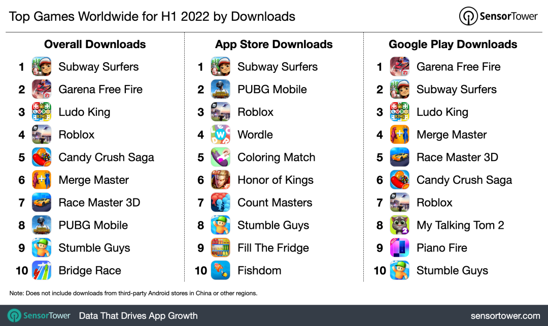 按照 Sensor Tower 的说法,《地铁跑酷》是上半年全球下载量最高的手游(去年同期排名第 6),吸引了大约 1.487 亿次下载。战术竞技手游《Garena Free Fire》以 1.472 亿次下载的数据排名第二,《Ludo King》排名第三,2022 年上半年下载量约为 8770 万次。