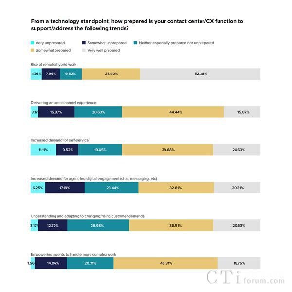 许多公司认为他们在技术方面已做好充分准备,以支持这种不断发展的环境。例如,超过 60% 的人表示,他们的联络中心/CX 职能要么准备充分,要么已准备好支持全渠道体验。此外,67% 的人已做好充分准备或已准备好了解和适应不断变化/上升的客户需求。