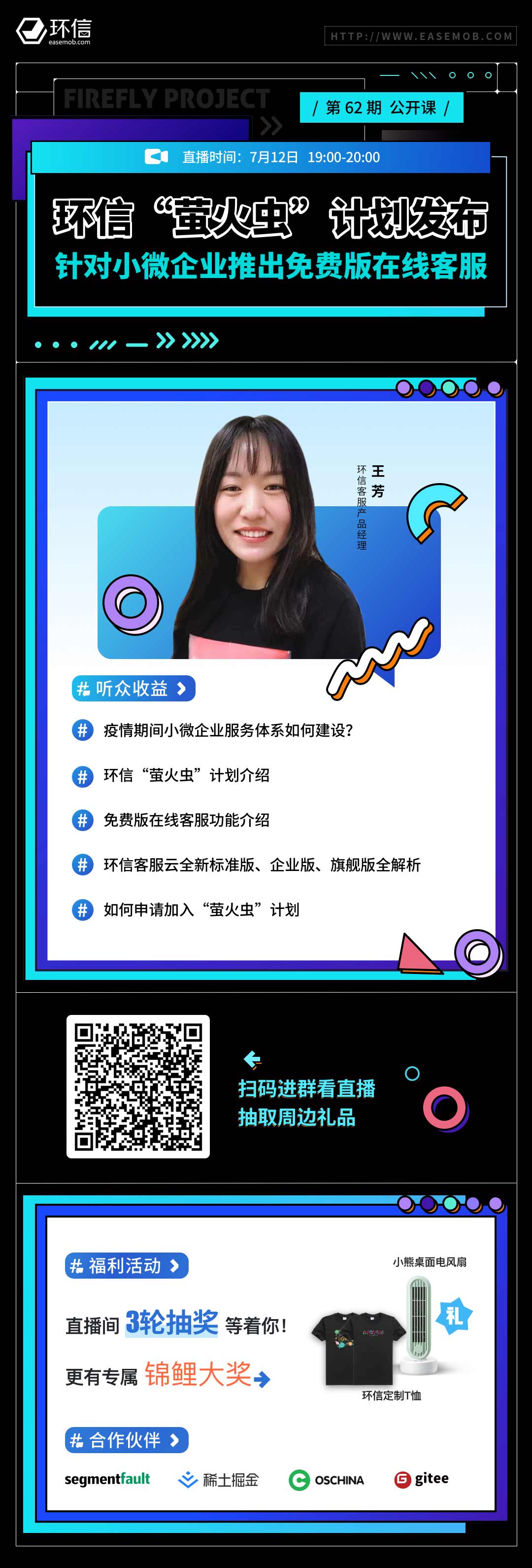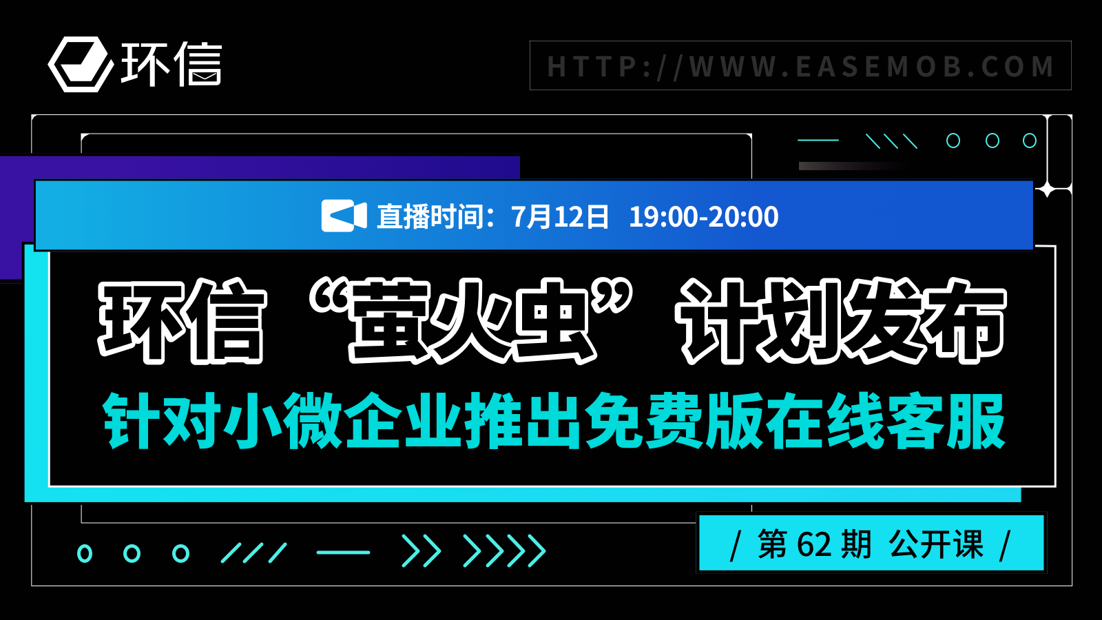 为推进国内中小微企业服务体系建设,助力小微企业服务创新发展,共同抗击疫情。环信推出公益活动“萤火虫计划”,针对中小微企业推出免费版在线客服,不限制使用期限。萤火虫星星之火也可以燎原,和中小微企业一起面向未来,帮助企业在上云用数智赋能过程中,建设更高效的全渠道智能客户服务体系,推动服务方式变革带动产业升级,支持新业态和新模式发展。环信在线客服免费版将免费开放给全国的中小微企业,本次直播公开课将详细给大家介绍一下公益活动“萤火虫计划”。同时,环信客服云发布了全新的标准版、企业版和旗舰版产品,7月12日锁定环信直播间,我们将逐一解读!
