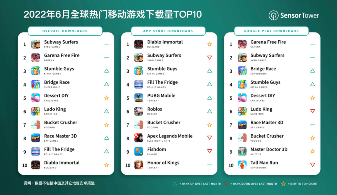 Sensor Tower 商店情报数据显示,SYBO Games《Subway Surfers》以 2600 万次下载,位列 6 月全球移动游戏下载榜榜首,比 2021 年 6 月增长 63.5%。印度是该游戏第一大市场,贡献了近 14.7% 的下载量;其次是美国,占 10.2%。全球热门移动游戏下载量 TOP10 完整榜单请见上文图表。注:下载量仅统计 App Store 和 Google Play,不包括第三方安卓市场。