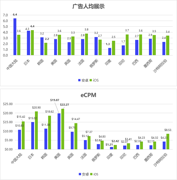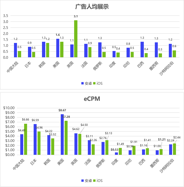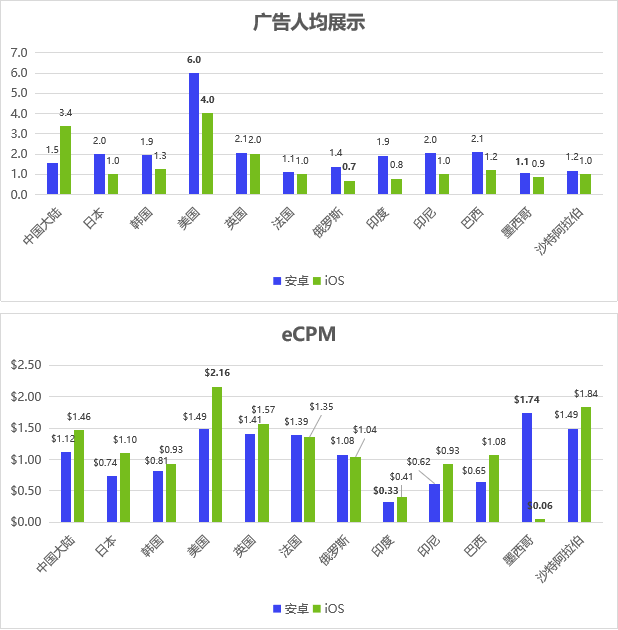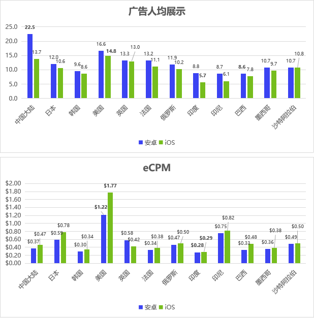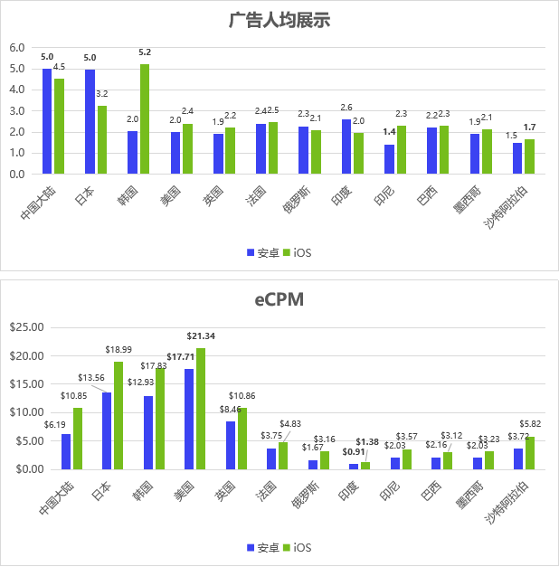 众所周知,人均广告变现收益是由 eCPM 和广告人均展示次数决定的。而 eCPM 是由广告平台对用户价值的判断决定的,不同的变现地区、广告类型,eCPM 差异较大。