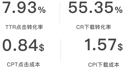 8 月,海外 Apple Ads 的平均点击转化率 TTR 7.93%,平均下载转化率 CR 55.35%,平均点击成本 CPT $0.84,平均下载成本 CPI $1.57。和 7 月相比,TTR 和 CR 均有提升,CPT 和 CPI 有所下降。