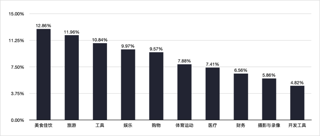 TTR 高于平均值 8.27% 的应用子品类共有 12 个,占统计品类总数的 50%。