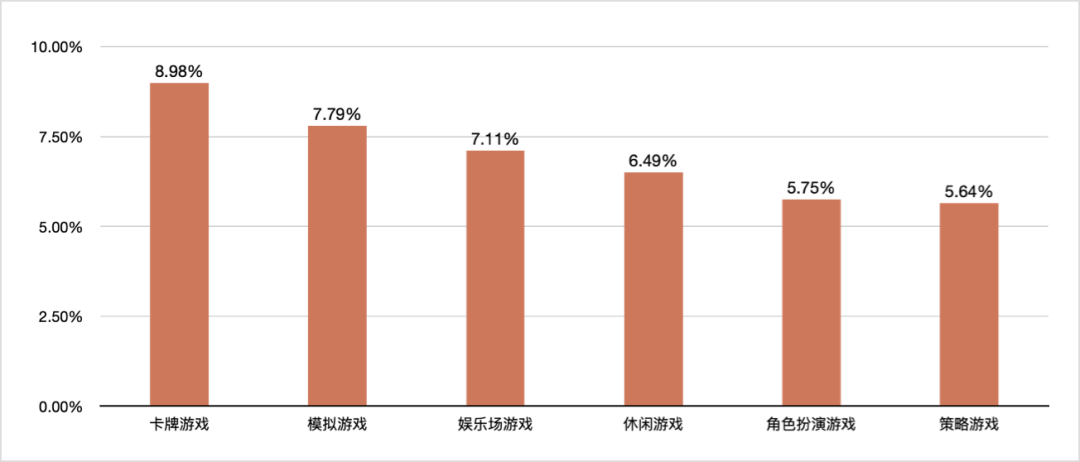 TTR 高于平均值 7.05% 的应用子品类有 5 个。卡牌游戏类 App 的平均 TTR 最高 8.98%,策略游戏类 App 最低 5.64%。
