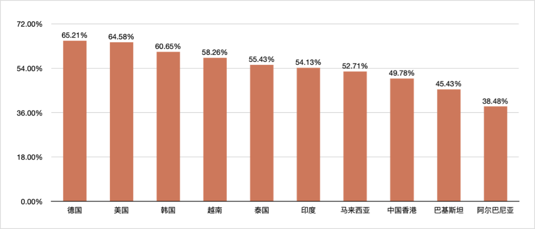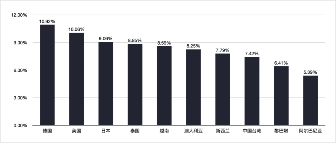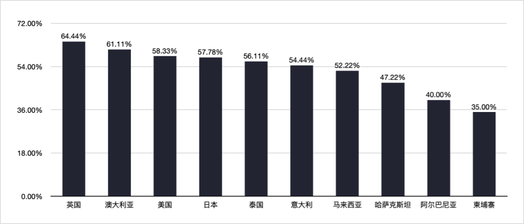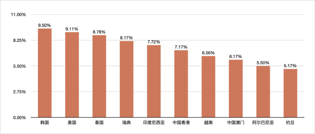 在 59 个国家/地区中,TTR 高于平均值 7.05% 的国家为 27 个,不足半数。