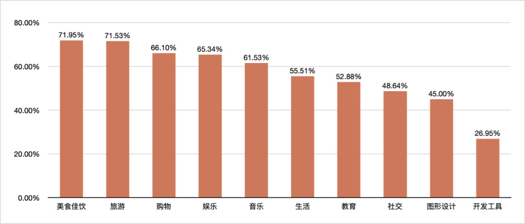 美食佳饮类 App 的平均 CR 延续了 7 月的强势表现,达 71.95%,开发工具类 App 的平均 CR 仍为最低,仅 26.95%。