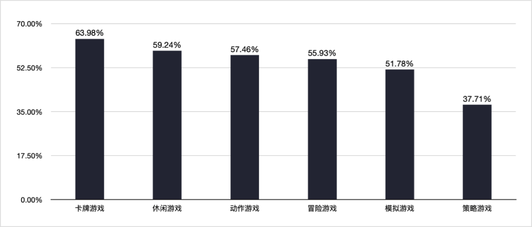 在游戏子品类中,平均 CR 最高的是卡牌游戏类 App,达到 63.98%,策略游戏类 App 的平均 CR 最低 37.71%。