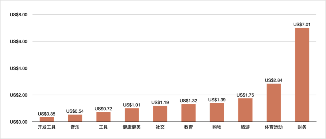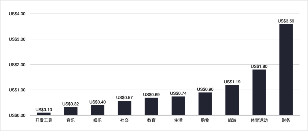 除财务类 App 以外,其他应用子品类的平均 CPT 范围在 $0.10-$1.80 之间。