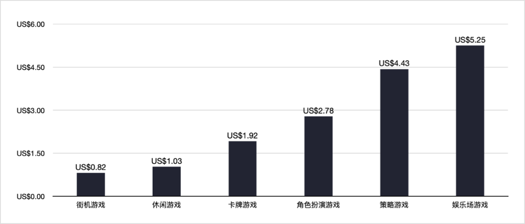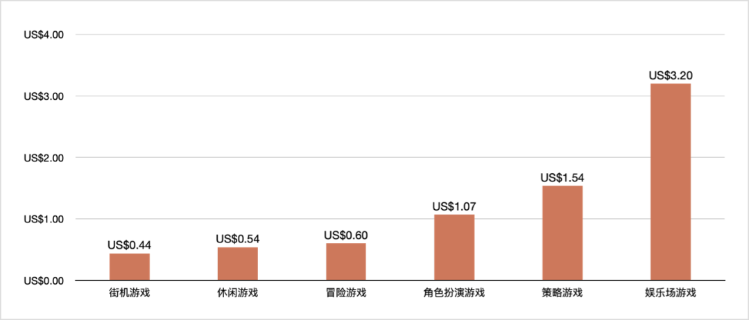 除娱乐场游戏类 App 以外,其他游戏子品类的平均 CPT 范围在 $0.44-$1.54 之间。