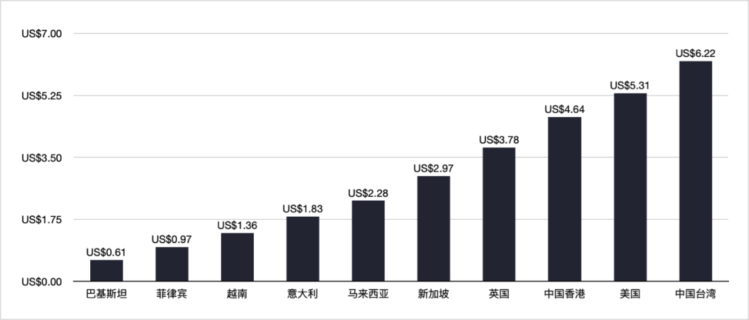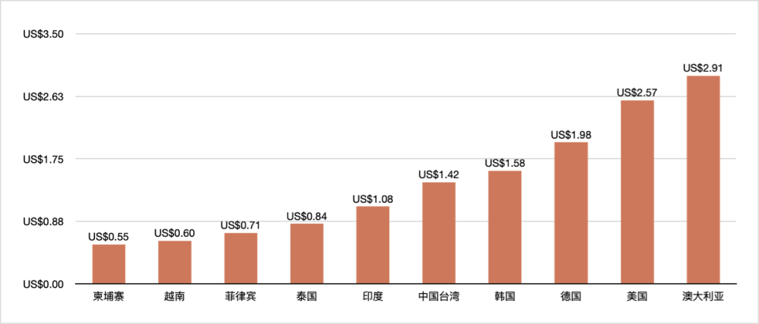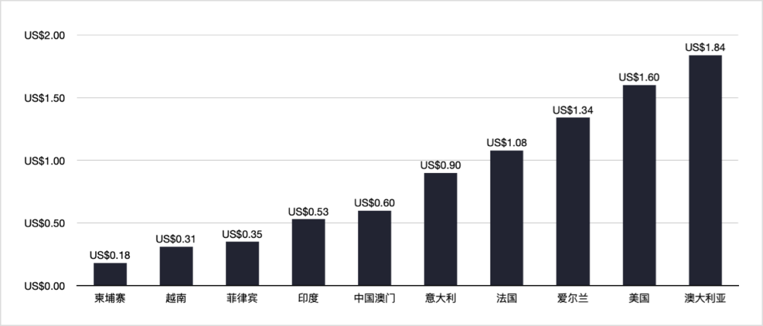 在 59 个国家/地区中,柬埔寨应用类 App 的平均 TTR 排在倒数第 10,而平均 CPT 最低,为 $0.18。