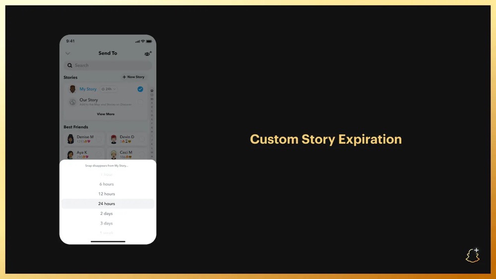 Snapchat Plus 会员用户可自由设置 Story 过期时间,范围为 1 小时至 1 周|图片来源:Snapchat