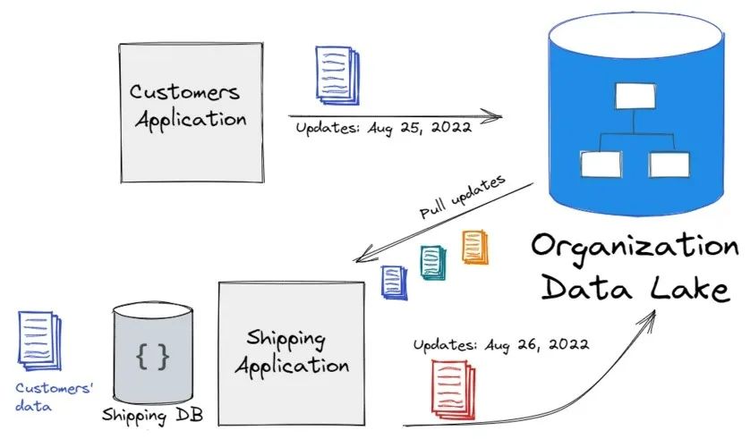 另一个选择是采用两阶段的流程,如图3所示。客户应用程序不必将其更新发送给发货应用程序,而是将其发送到组织数据湖。通过这种方式,每个应用程序将希望公开的数据发送到一个中心位置。其他应用程序可以将需要的数据从数据湖复制到自己的数据库中。