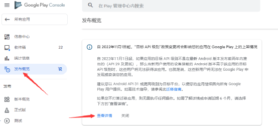 开发者登录后台后选择相应应用进入“发布概览”功能中,这里会给出关于 API 级别升级的提示,开发者可以选择“查看详情”功能按钮进行后续的操作。