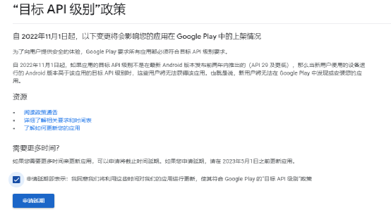 由于某些原因导致开发者无法近期更新的话,可以通过 Play 管理中心后台进行一次性的延期申请。