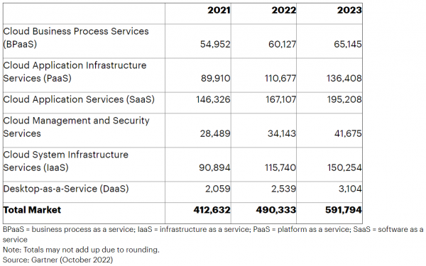 Gartner预计,2023年最终用户支出增幅最高的是基础设施即服务(IaaS),达到29.8%(见表1)。另外,预计所有细分市场都将在2023年实现增长。