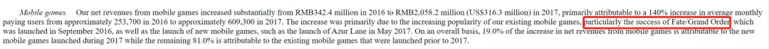 2017年,两款游戏合计占到了B站移动游戏总收入的80%以上,一款是B站在2016年代理的日本Aniplex发行的Fate系列的手游《Fate/GrandOrder》(命运-冠位指定,简称FGO,B站代理的简称BGO),占到71.8%,曾在2017年5月份一度超越了腾讯的王者荣耀登顶AppStore榜首;另外一款贡献了12.7%收入的是2016年代理的《碧蓝航线》,目前在B站代理的游戏中排名第二。