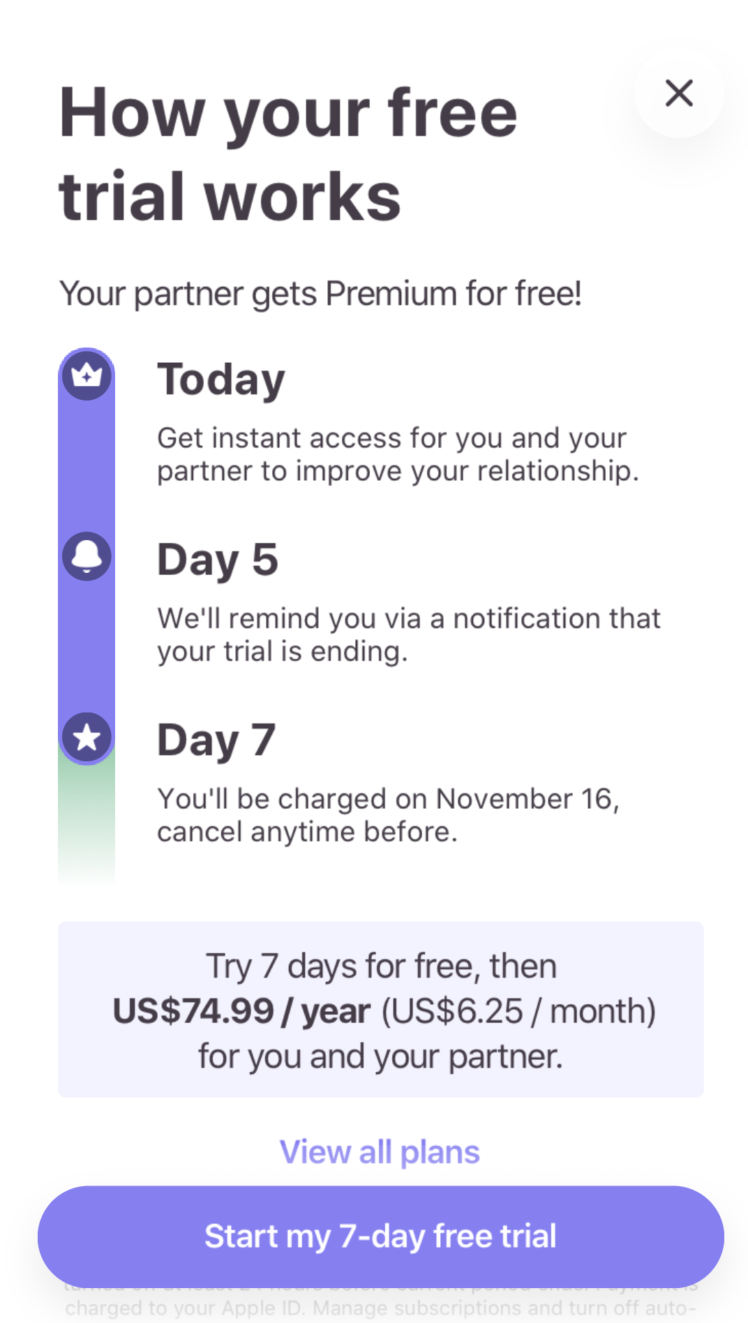 做完量身定制的测试后,Paired就在用户刚刚体验产品的初期发起“七天免费试用”的邀请,一经开通便是按月自动续费。如果不选择免费试用的计划或是按月订阅,其余功能便无法继续使用。不过,情侣双方只需要有一人开通付费计划,两者都可以享受服务。