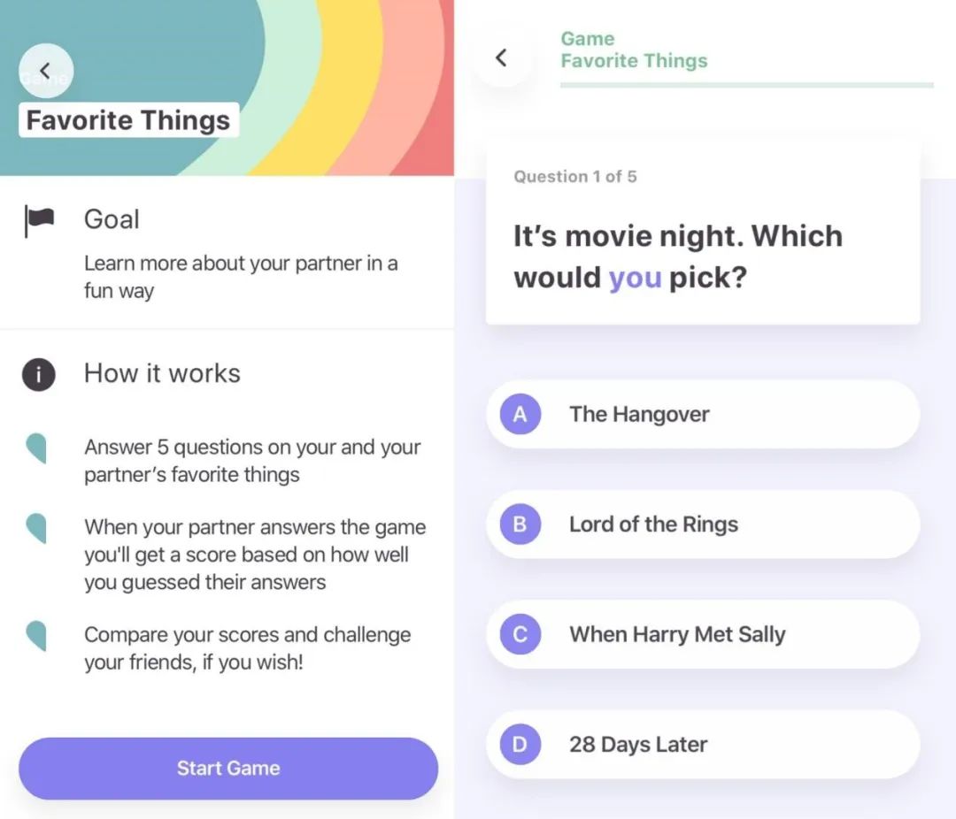 Paired给出的游戏实际上也是以问答方式进行它会提供5道选择题,用户先作答,再猜测伴侣面对这些问题时会做出的选择,根据默契度给出排名和分数。实际上,它很像大家常在朋友圈流行的“测测你有多了解我”系列问卷,测试双方的默契度,并进一步增进感情。