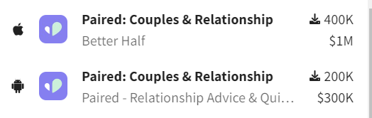 Paired为用户们提供了卓越的服务和使用体验,收费也并不便宜。它的单月订阅为14.99美金、包年订阅74.99美金。正因此,其月流水表现也格外不凡。根据Sensor Tower数据显示,Paired双端月收入高达130万美金,算得上是此品类中格外吸金的产品之一。