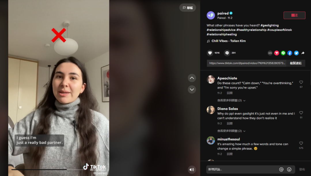 在最近一条点赞高达10万的TikTok视频中,Paired团队的一位女生出镜讲述“恋爱中常常听过的那些话”。“You are crazy!”、“I am sorry you feel that way.”这些令人恼火的吵架对白无疑成功挑动围观群众的往事回忆,网友们在评论区展开热烈讨论,并激情补充了一些听完令人窒息的糟糕对话实录。