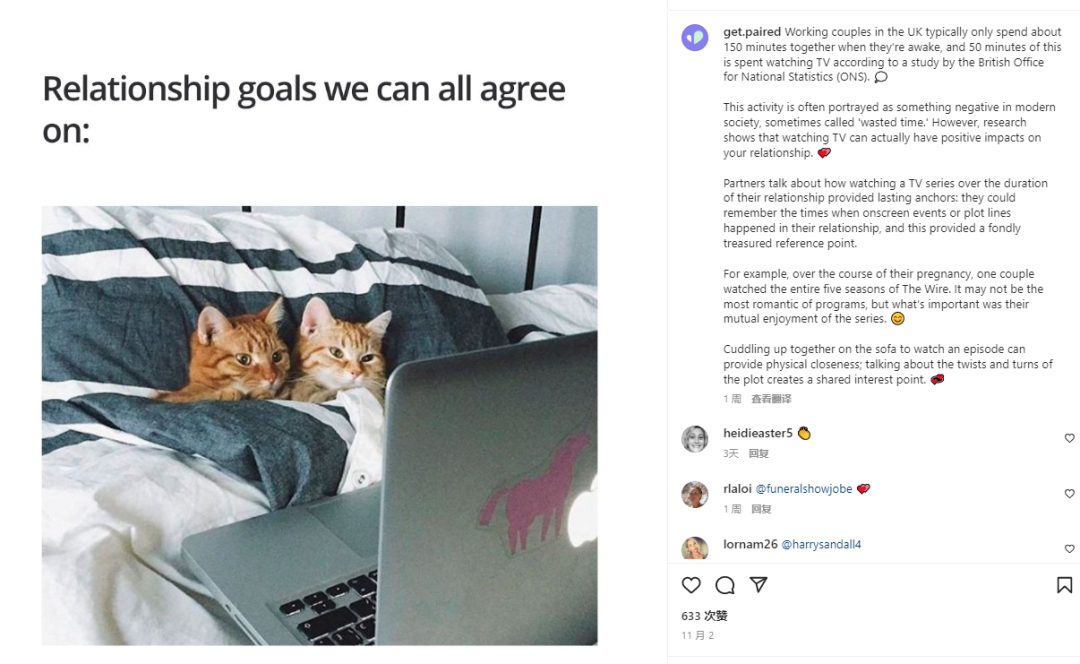 他们也会时不时分享一些关于爱情保鲜的小贴士,比如分享“情侣一起看电视对感情的积极影响”,今天也请和你的伴侣一起窝在沙发里看电视吧,这不是伪科学,是英国国家统计局的研究结果哦。