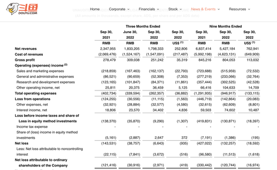 游戏直播平台斗鱼在11月21日晚发布了其2022年第三季度财报,财报显示,斗鱼第三季度营收17.983亿元,同比下滑23.4%;第三季度净亏损660万元,同比收窄95.4%。