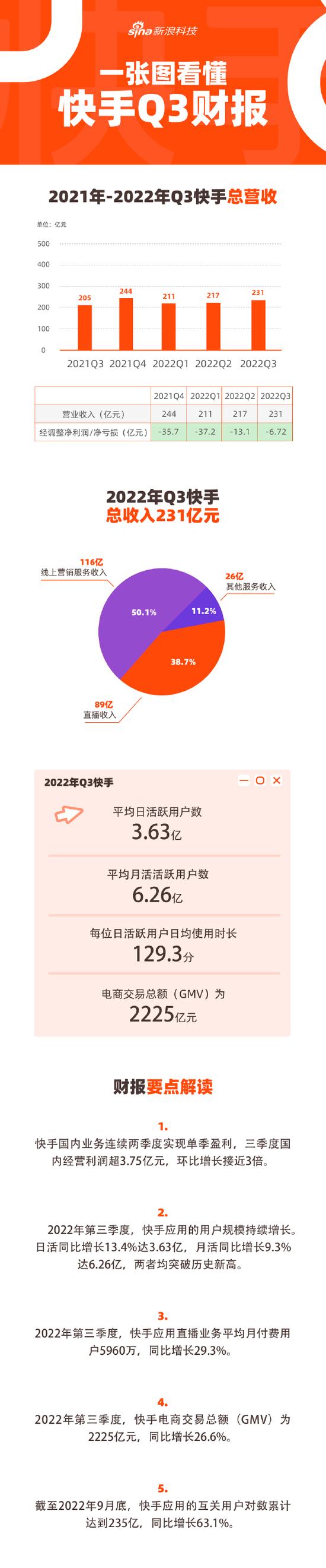 一图看懂快手Q3财报:GMV同比增长26.6% 日活和月活均突破历史新高