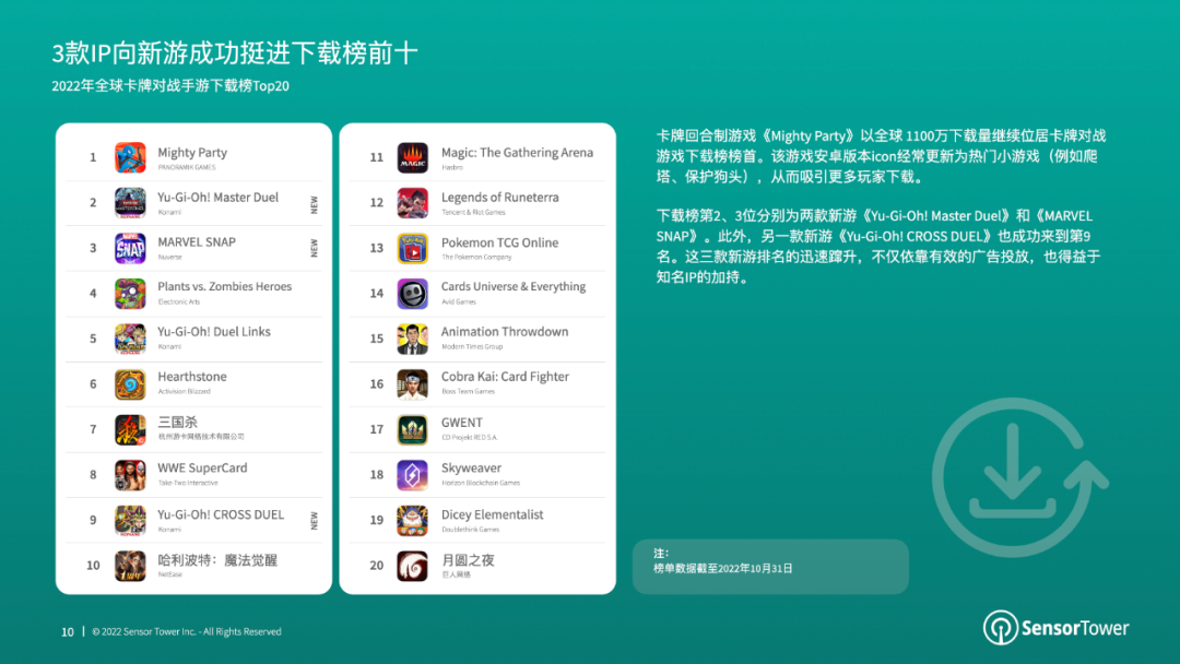下载量方面,卡牌回合制游戏《Mighty Party》以全球 1100 万下载量继续位居卡牌对战游戏下载榜榜首。该游戏安卓版本 icon 经常更新为热门小游戏(例如爬塔、保护狗头),以吸引更多玩家下载。