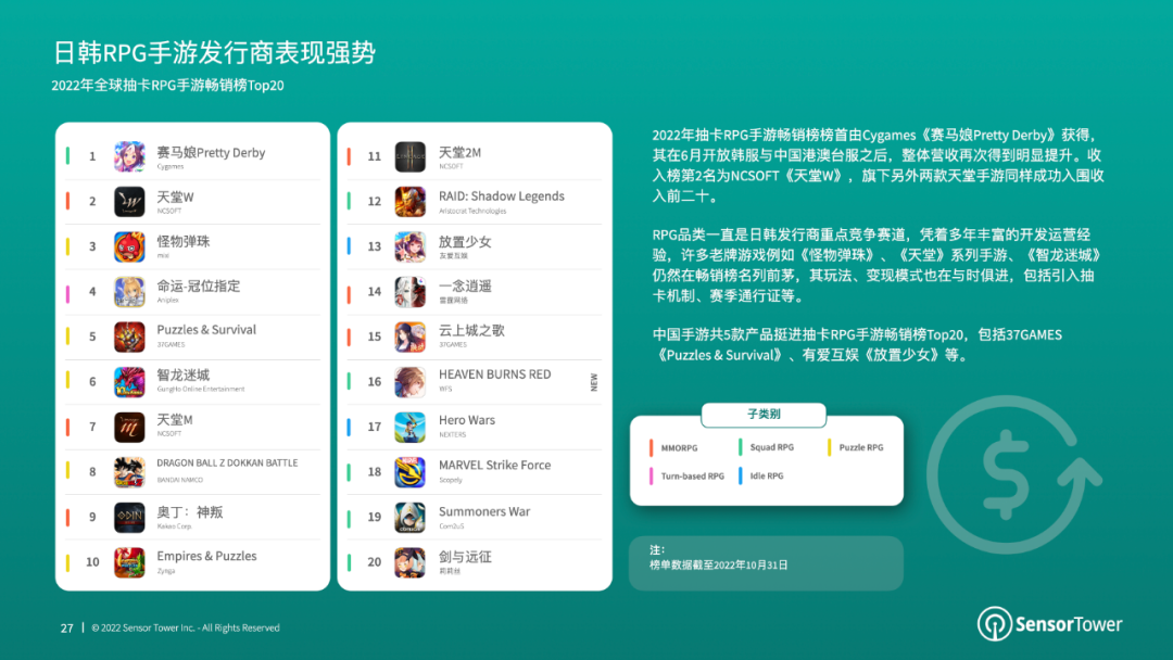 2022 年抽卡 RPG 手游畅销榜榜首由 Cygames《赛马娘 Pretty Derby》获得,其在 6 月开放韩服与中国港澳台服之后,整体营收再次得到明显提升。收入榜第 2 名为 NCSOFT《天堂 W》,旗下另外两款天堂手游同样成功入围收入前二十。