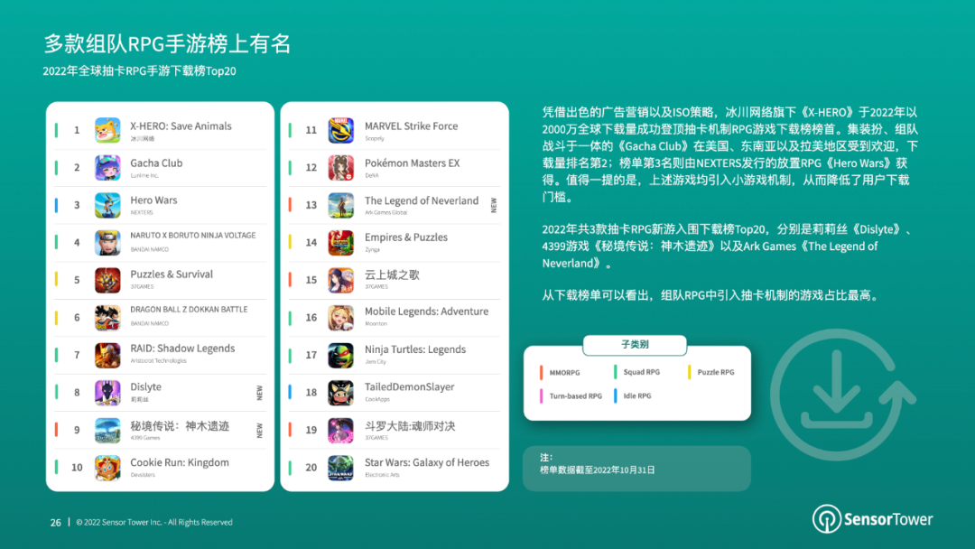从下载榜单可以看出,组队 RPG 中引入抽卡机制的游戏占比最高。