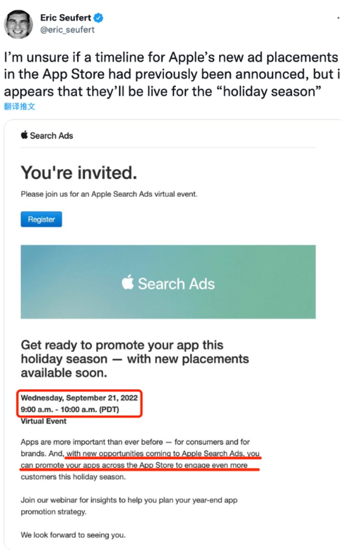 在苹果向开发者发出的邀请函中写道,苹果将在 App Store 增加广告位。开发商可以在新的广告位投放广告来推广其 App,以便在即将到来的假日购物季吸引更多用户。