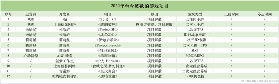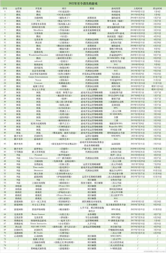时代财经根据公开报道统计,2022年内至少已有75款游戏项目宣布解散或停运。这些游戏大多由腾讯、网易、B站、朝夕光年等游戏大厂运营,其中不少游戏曾取得过极佳的成绩。但即便如此,也没能改变停运的结局,一纸公告已是它们最后的体面。