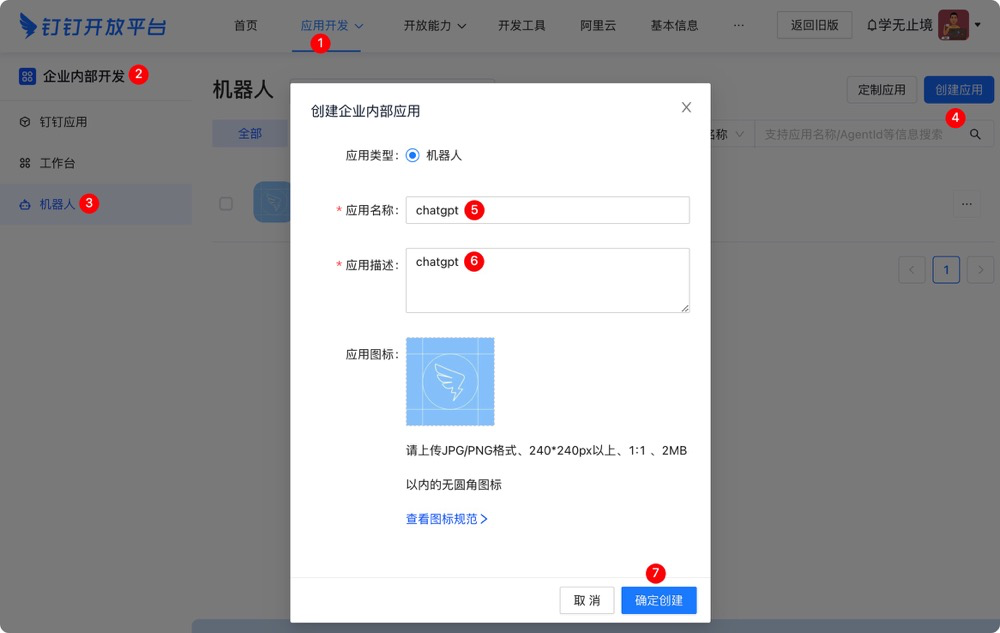 创建步骤参考文档:企业内部开发机器人,或者根据如下步骤进行配置。