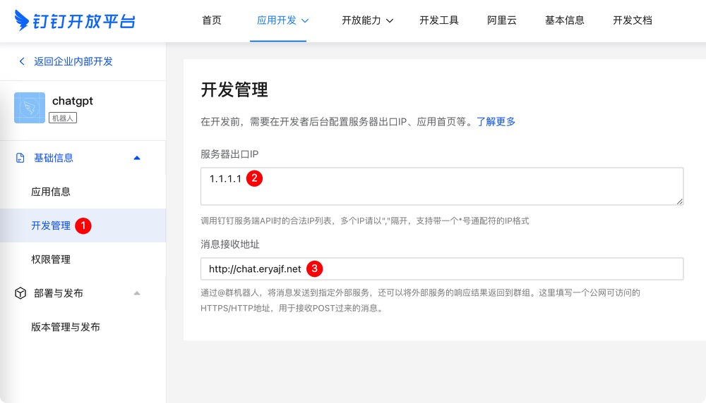 创建完毕之后,点击机器人开发管理,然后配置将要部署的服务所在服务器的出口IP,以及将要给服务配置的域名。