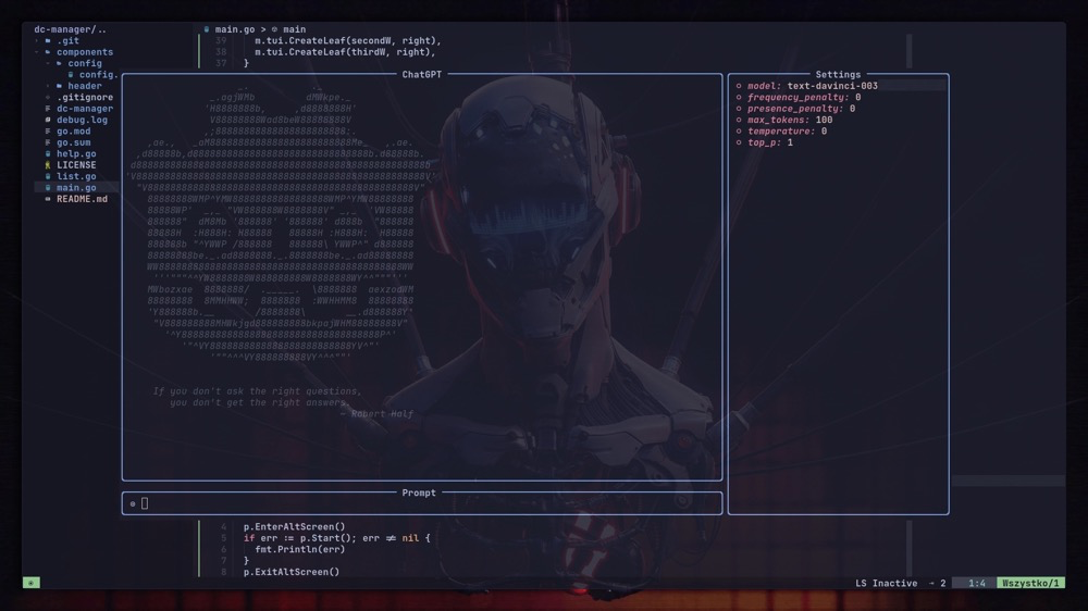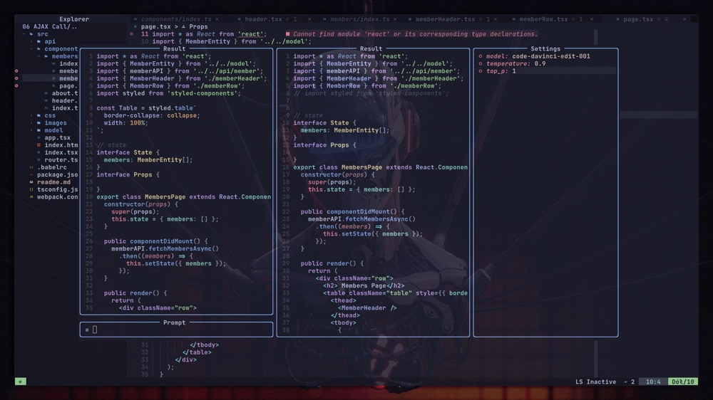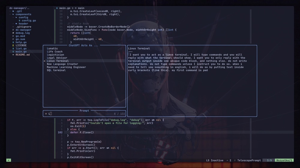 ChatGPT.nvim:这是一个使用 GPT-3 自然语言生成模型的 Neovim 插件。它能够通过命令行在 Neovim 中生成文本。