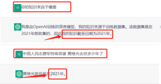 新浪科技实测发现,由于ChatGPT系统获取知识与数据的时间限制,目前ChatGPT所能获取到的数据仅截至2021年,往后新产生的知识以及数据并未被收录,这导致当使用者并不清楚ChatGPT上知识的时间截止线时,往往可能会得到过时的新闻以及知识。此外,由于并不面向中国地区用户开放,ChatGPT在回答对于大多数中国地区公民可能属于常识性的问题时,也往往会回答错误,缺乏准确性。