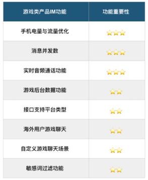 因此企业在游戏中开始加入各种丰富有趣的IM即时通讯功能。通过IM即时通讯能力,一方面可以有效增强不同的游戏用户之间的沟通交流,增强游戏本身的趣味性;另一方面可以增加用户对游戏产品的使用粘性,促进用户使用产品的活跃度。具体到单项的IM功能,游戏类产品会更加注重以下八项功能痛点,这其中环信即时通讯云优势明显。