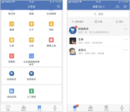 开通了环信客服云的企业微信长的是什么样子呢?在企业微信的工作台,会出现一个“财务助手”(这个名字是企业自己取的)的按钮: