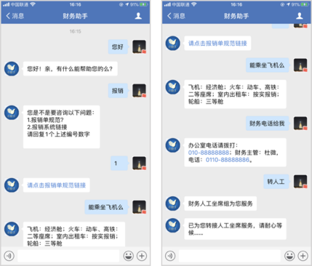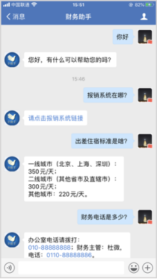 下面是一个典型的员工通过企业微信向财务部门咨询问题,由财务机器人来回答问题的截图:
