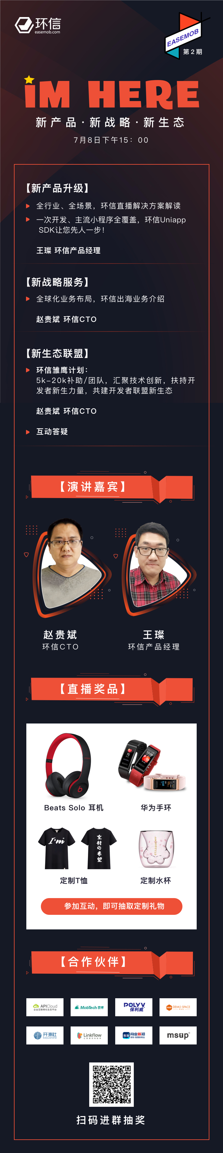 新产品·新战略·新生态!2020年7月8日(周三)下午3点,一起锁定环信“IM Here”第二期,让我们来一期探讨:5G时代直播带来的新增长机会?中小企业选型直播方案应该重视哪些痛点?避开哪些坑点?掘金海外,APP企业出海要注意什么?现在市面上的小程序解决方案哪些更靠谱,环信雏鹰计划5K-20K现金补贴开发者是个什么鬼……现场直播群系统还将随机抽取小伙伴赞助的Beats Solo无线蓝牙耳机、华为运动手环、星巴克猫爪杯、环信文化衫等好礼,赶紧猛戳报名吧!
