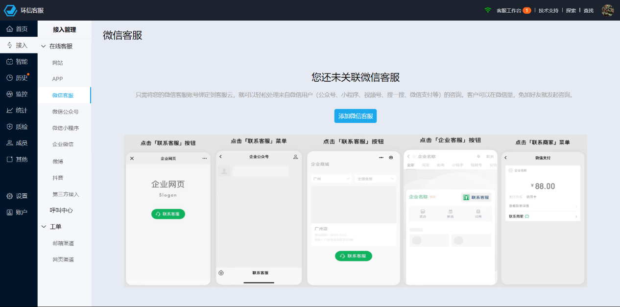 ◆实现微信全域场景接入:多个微信相关功能页面(微信公众号、小程序、视频号、搜一搜、微信支付、微信内网页)均可成为客户发起客服会话的入口。