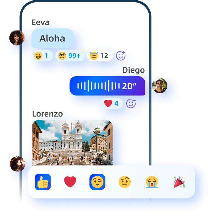 支持文本消息、动态表情、图片、语音、视频、附件、文件、位置、扩展消息、透传消息、自定义消息等 IM 功能;