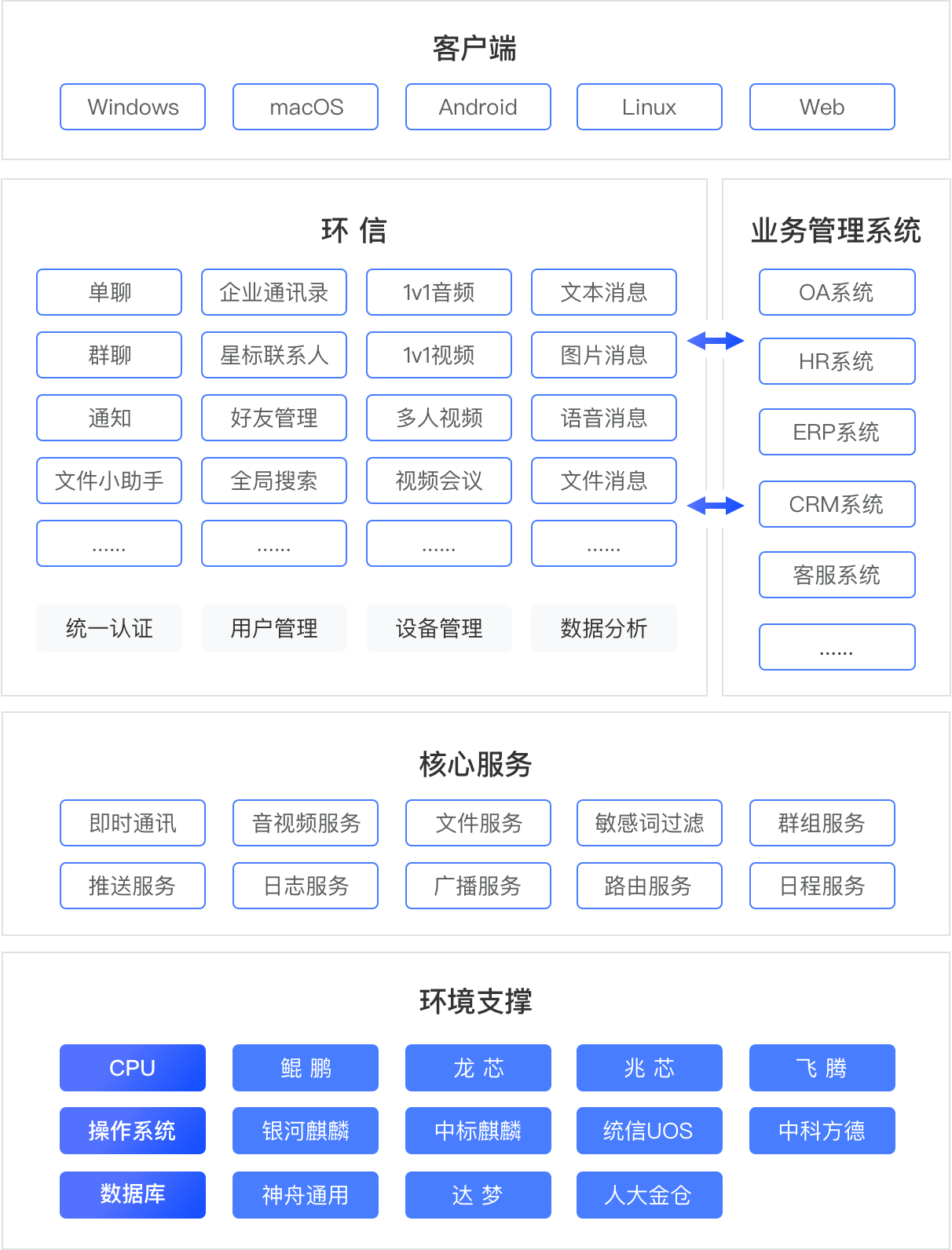 信创产业已成为国家十四五规划发展的重要组成部分,环信云作为信创产业中“承上启下”的一环,严格遵循国家法律法规和技术标准规范,积极响应国内自主可控、安全可控要求,从IT基础设置、操作系统、数据库等方面进行国产化升级,为“2+8”体系用户提供国产一体化即时通讯解决方案