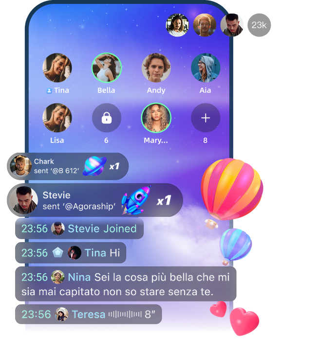 纯音频社交互动方案,以房间为单位,设有4-8 个麦位,支持观众上麦与主播互动,适用于情感交流、相亲交友、K歌语聊、游戏开黑、赛事讨论等场景