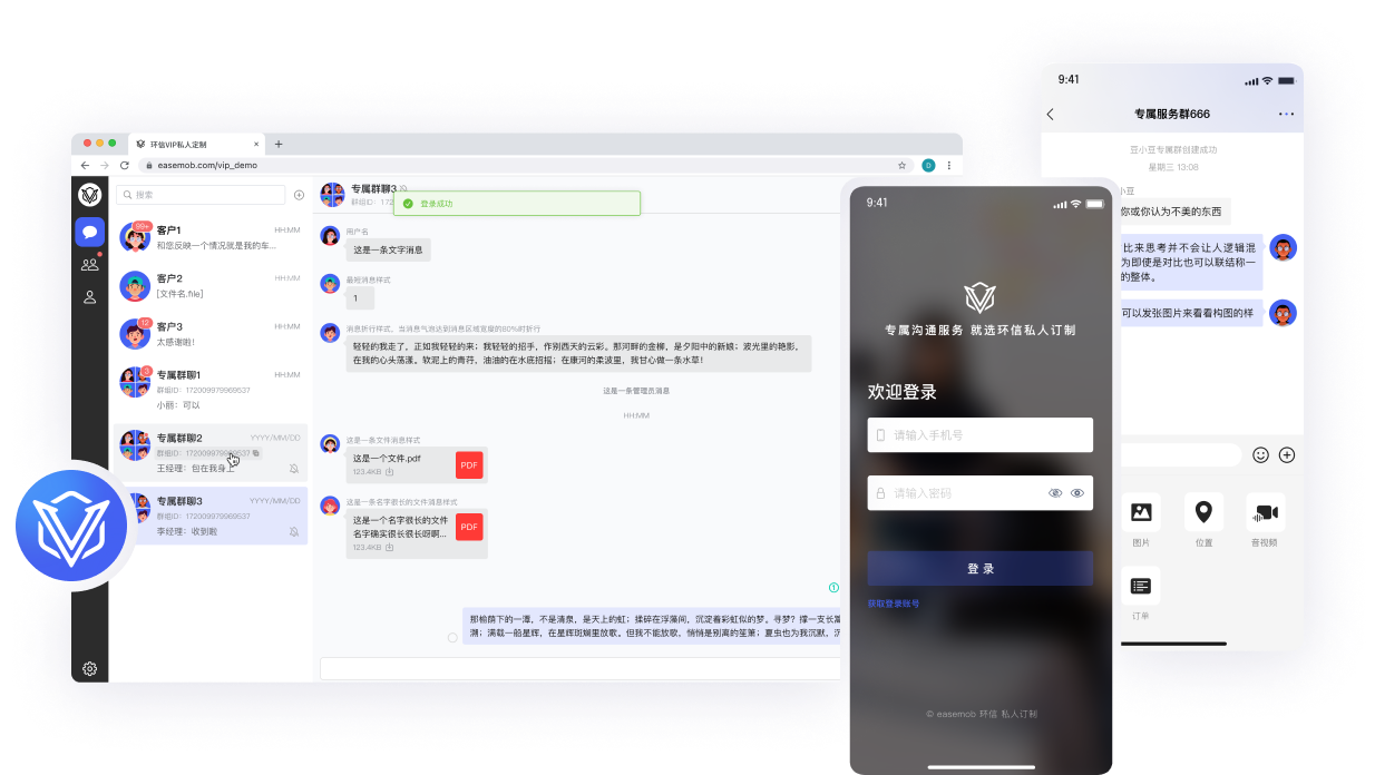 支持稳定可靠的消息传输通道,提供文本、图片、文件及自定义消息类型,可对接工单、订单等业务系统,实现业务联动,提高处理效率